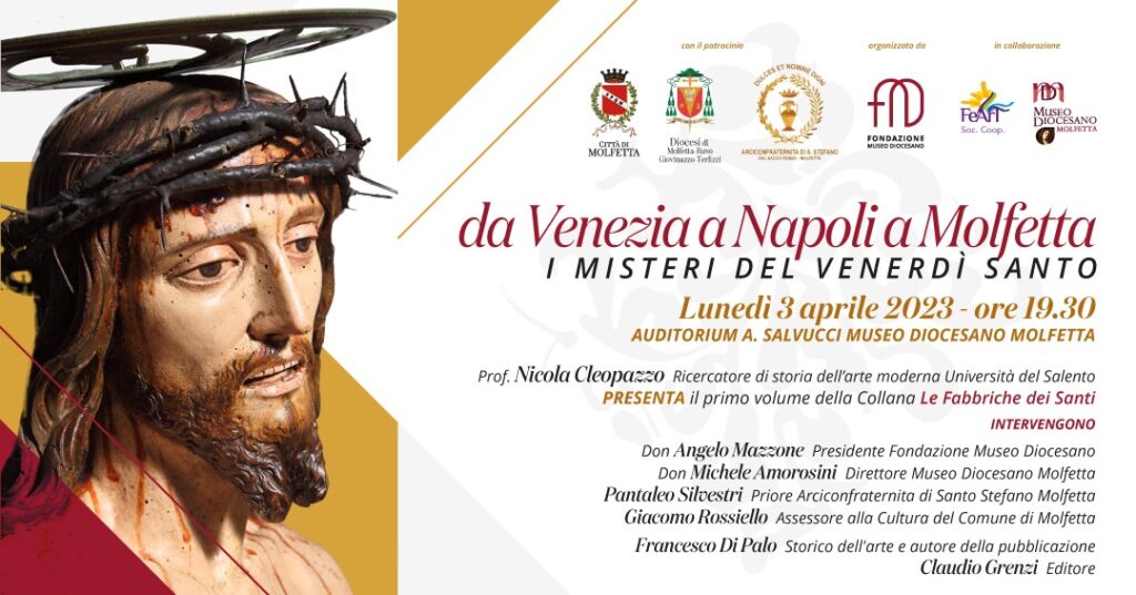 L’iniziativa, inserita nella programmazione degli eventi culturali del Comune di Molfetta per la Quaresima 2023, vedrà gli interventi di: don Angelo Mazzone, presidente della Fondazione Museo Diocesano; don Michele Amorosini, direttore del Museo; Pantaleo Silvestri, Priore dell’Arciconfraternita di Santo Stefano e Giacomo Rossiello, Assessore alla Cultura della Città di Molfetta; nonché dell’autore e dell’editore.