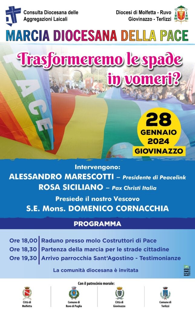 Avrà luogo a Giovinazzo, domenica 28 gennaio, l’annuale marcia della pace, organizzata dalla Consulta Diocesana delle Aggregazioni Laicali e dalla nostra Diocesi.