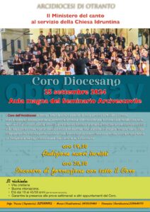 “Invitiamo quanti sentono di avere il dono di una bella voce e desiderano metterla a servizio della liturgia nella Chiesa Idruntina a prendere parte all’audizione dei nuovi iscritti”, dice don Biagio Mandorino, direttore del Coro. “Estendiamo l’invito anche a chi sa suonare qualche strumento musicale”.