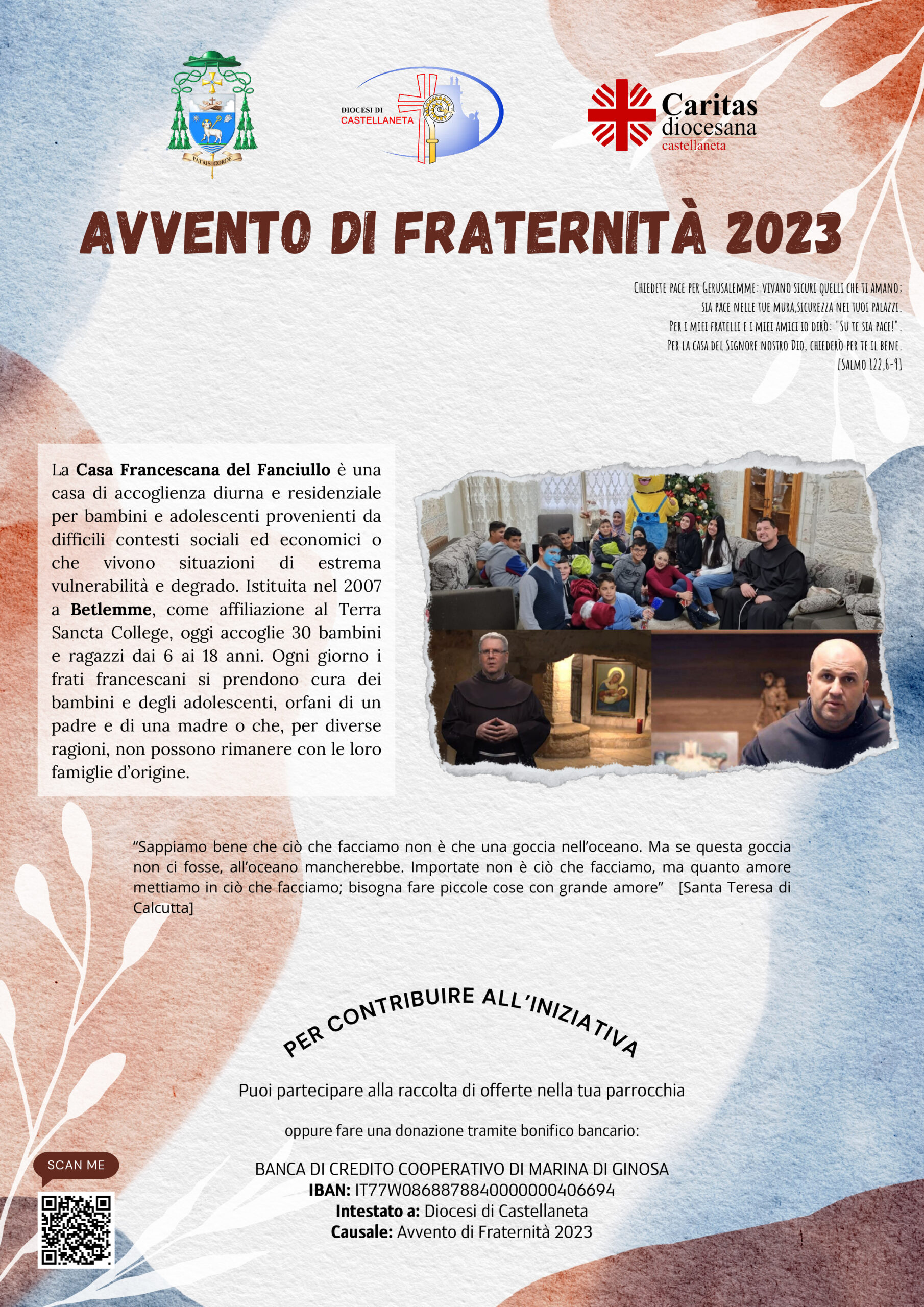 - inviare il proprio bonifico: BANCA DI CREDITO COOPERATIVO DI MARINA DI GINOSA – IBAN: IT77W0868878840000000406694 INTESTATO: DIOCESI DI CASTELLANETA – Causale: Avvento di fraternità 2023.