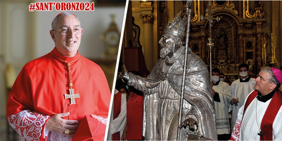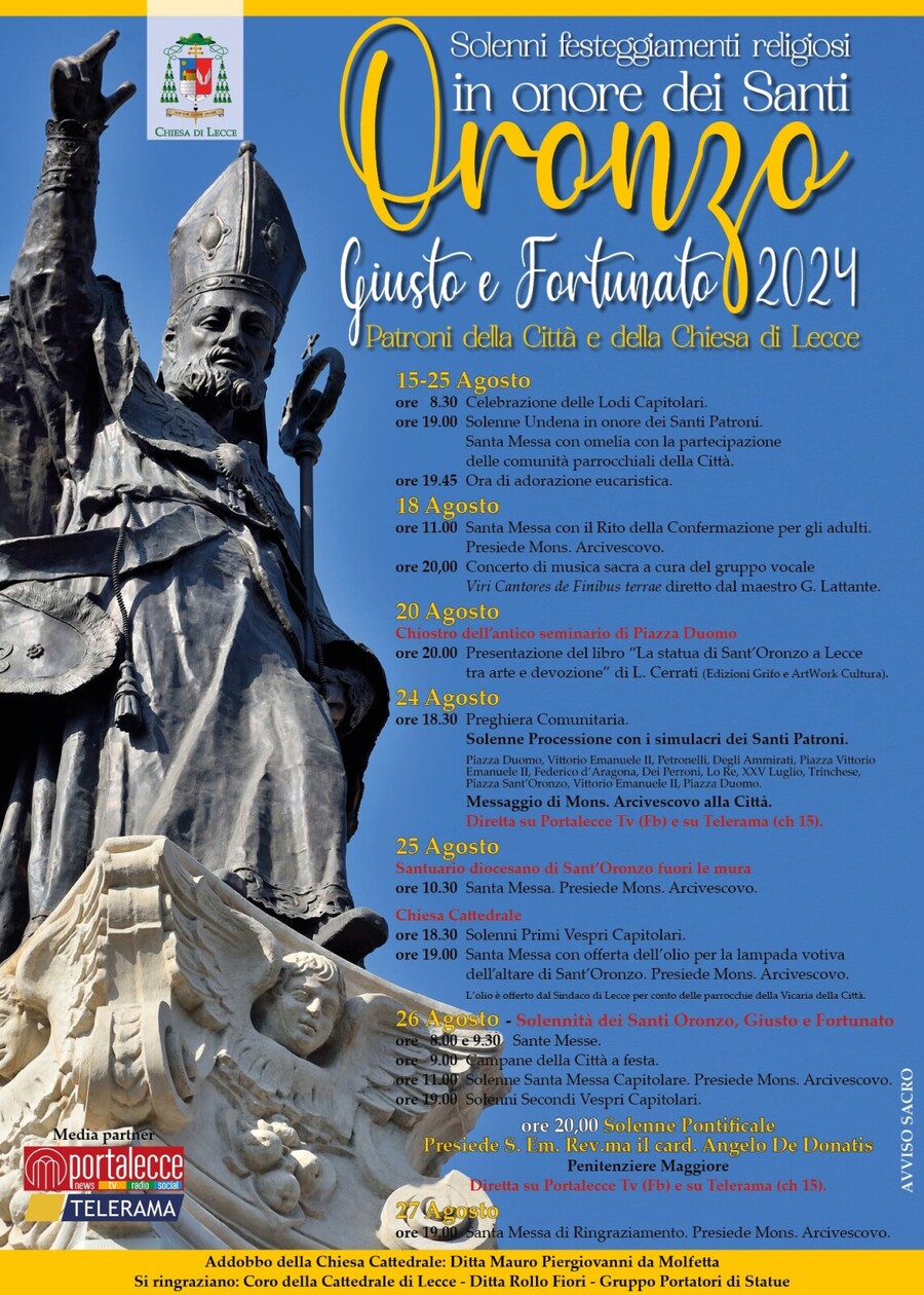 Lunedì 26 agosto, solennità dei Santi Oronzo, Giusto e Fortunato, al mattino, in cattedrale tre messe: alle 8, alle 9,30 e alle 11. La solenne messa capitolare delle 11 sarà presieduta da mons. Seccia. La sera alle 19 i solenni Secondi Vespri Capitolari che confluiranno poi nel solenne pontificale delle 20, presieduto dal card. Angelo De Donatis, Penitenziere Maggiore e, fino a pochi mesi fa, Vicario del Santo Padre per la diocesi di Roma. Alla solenne concelebrazione sono stati invitati anche i cardinali, gli arcivescovi e i vescovi originari della diocesi, in essa residenti o che l’hanno guidata in passato. Anche il pontificale verrà trasmesso in diretta sulla pagina facebook di Portalecce e sul canale 15 di Telerama.
