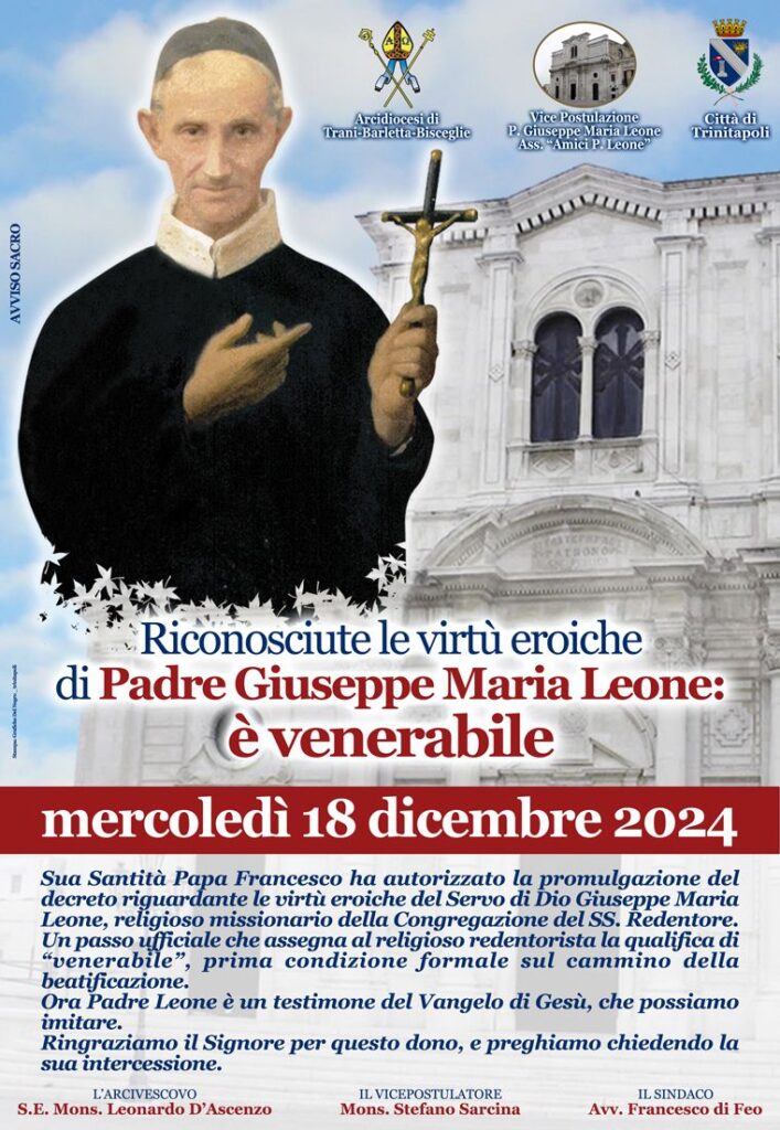 Questa mattina Papa Francesco ha ricevuto in udienza il Cardinale Marcello Semeraro, Prefetto della Congregazione delle Cause dei Santi, autorizzando tra l’altro la promulgazione del Decreto riguardante le virtù eroiche del Servo di Dio Giuseppe Maria Leone, nato a Trinitapoli, sacerdote professo della Congregazione del Santissimo Redentore. Di seguito la lettera alla comunità diocesana con cui l’Arcivescovo mons. Leonardo D’Ascenzo, annuncia la promulgazione … Continua a leggere