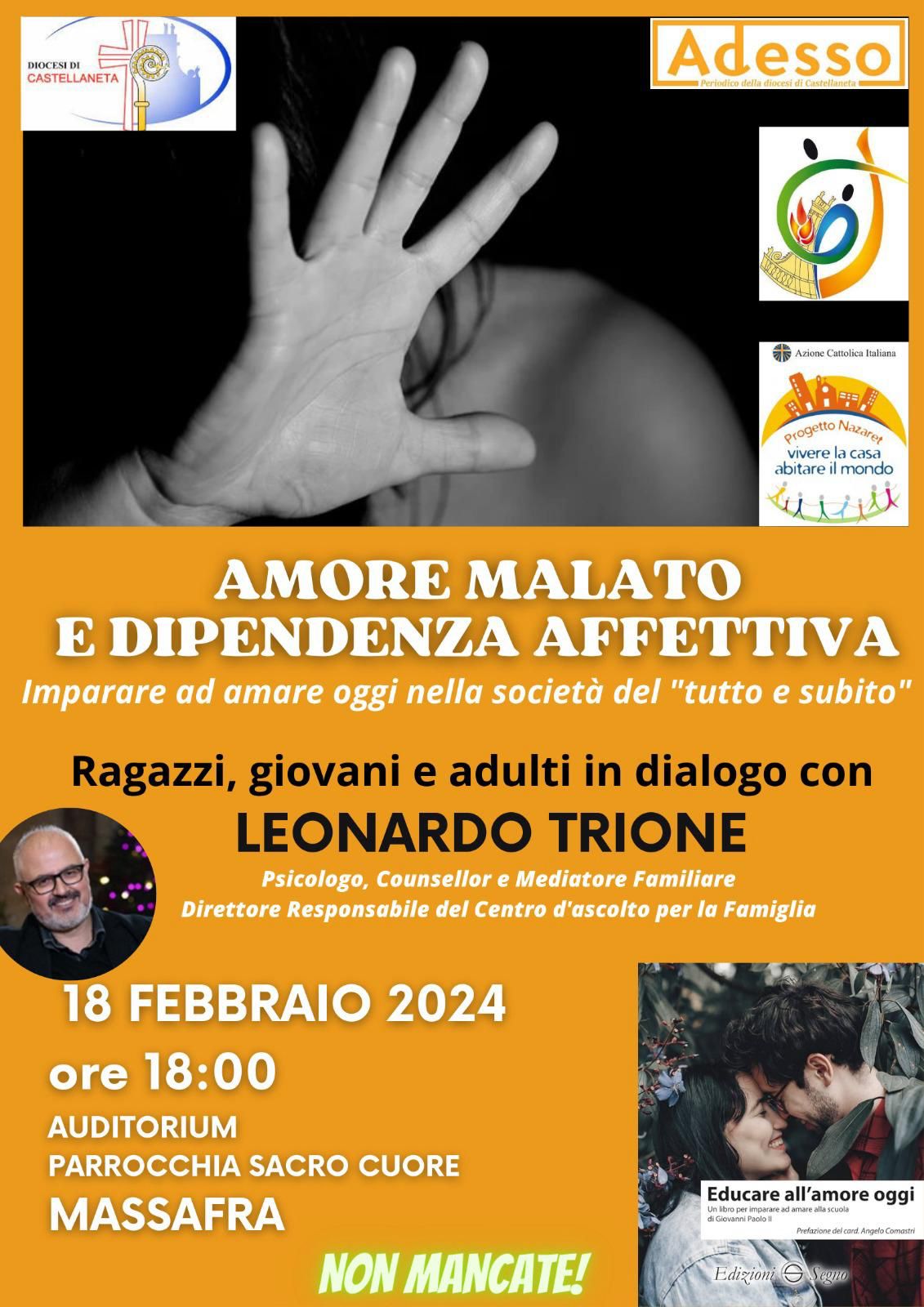 Domenica 18 Febbraio 2024 alle ore 18 nell’auditorium parrocchiale del Sacro Cuore di Massafra, il Progetto Nazareth, in collaborazione con l’Ufficio delle Comunicazioni Sociali , dell’Ufficio di Pastorale Giovanile della Diocesi di Castellaneta e dei giovani del Clan Panda del gruppo scout Agesci Massafra 1 , ha organizzato un incontro sull’educazione all’amore per i ragazzi, i giovani e gli adulti guidato dal Dott. Leonardo Trione, psicologo, psicoterapeuta e mediatore famigliare.