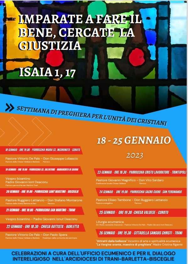 IN DIOCESI LA SETTIMANA DI PREGHIERA PER L’UNITA’ DEI CRISTIANI La “Settimana di preghiera per l’unità dei cristiani” un’iniziativa ecumenica di preghiera nel quale tutte le confessioni cristiane pregano insieme per il raggiungimento della piena unità che è il volere di Cristo stesso. Tradizionalmente, si svolge dal 18 al 25 gennaio, perché compresa tra la festa della cattedra di san Pietro e quella della … Continua a leggere IN DIOCESI LA SETTIMANA DI PREGHIERA PER L’UNITA’ DEI CRISTIANI