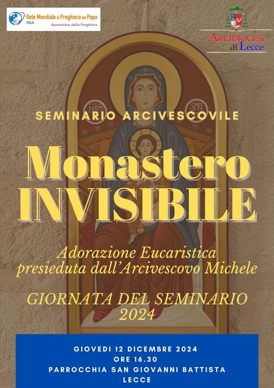 Appuntamento il prossimo giovedì 12 dicembre alle 16.30, presso la chiesa parrocchiale di San Giovanni Battista a Lecce, per l’esperienza del Monastero invisibile. Sorto per volontà del compianto arcivescovo Cosmo Francesco Ruppi, pastore della Chiesa di Lecce dal 1988 al 2009, l’esperienza, si è delineata in maniera sempre più concreta, e, l’Apostolato della Preghiera, è il movimento ecclesiale che anima e guida questo momento di condivisione particolare all’interno delle comunità, ed è un impegno che può essere vissuto da tutti: giovani e anziani, ammalati, singoli e famiglie.