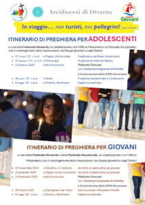 In questo mese di ottobre, precisamente giovedì 17 ottobre, presso la Parrocchia Immacolata a Maglie, inizia l’Itinerario di Preghiera rivolto a tutti gli adolescenti della nostra diocesi.