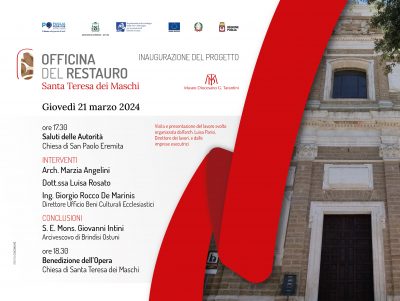 I lavori e la finalità del progetto “Officina del Restauro” verranno presentati il 21 marzo alle ore 17.30 presso la chiesa di San Paolo eremita, sezione della Rete Museale dell’Arcidiocesi di Brindisi Ostuni che nel gennaio 2021 S. E. mons. Domenico Caliandro, arcivescovo emerito di Brindisi Ostuni, ha eretto canonicamente con un decreto, insieme alla Chiesa delle Scuole Pie e alla sezione di Ostuni sita al piano terra del Palazzo dell’Episcopio.