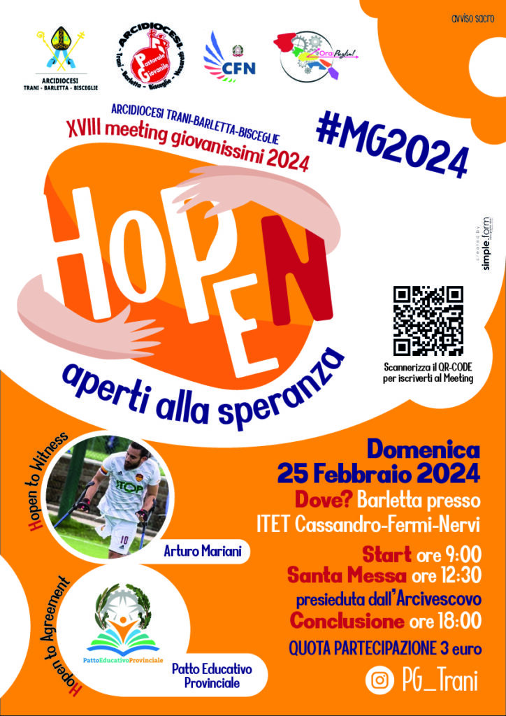 Il 25 febbraio alle ore 9.00 presso l’ITET – CASSANDRO-FERMI-NERVI, partirà questo straordinario appuntamento che raduna tutti i giovanissimi dell’arcidiocesi. Il meeting quest’anno, spronati da papa Francesco e dall’imminente anno giubilare, avrà come tema LA SPERANZA… e il restare ad essa sempre aperti, pur nelle prove e difficoltà. Allora… “HOPEN – Aperti alla speranza”, VI ASPETTIAMO IN TANTISSIMI! Pre-iscrizione al seguente LINK PER L’ISCRIZIONE INFO UTILI in allegato … Continua a leggere