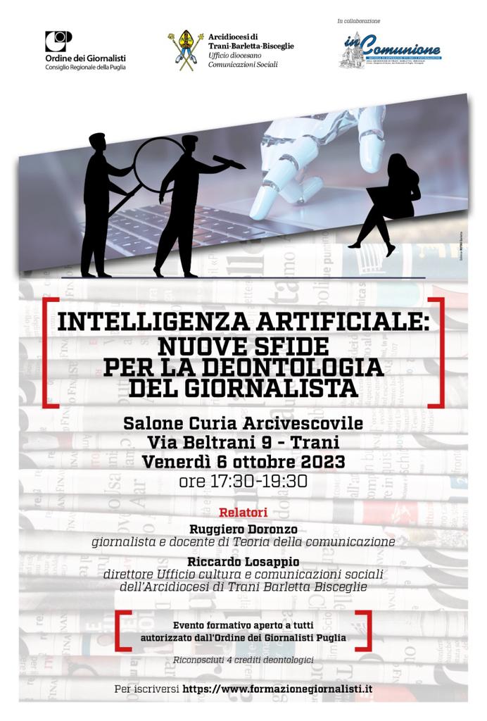 dioc. Trani INTELLIGENZA ARTIFICIALE: NUOVE SFIDE PER LA DEONTOLOGIA DEL GIORNALISTA 2 Ottobre 2023 0 25 clic qui per l’articolo sul sito della Diocesi di Trani-Bisceglie-Barletta ARTICOLI CORRELATIALTRO DALL'AUTORE GIORNATA PRO ORANTIBUS – MONASTERO SAN RUGGIERO INCONTRO DI CLERO ZONA PASTORALE TRANI “SAN NICOLA PELLEGRINO” Giovedì 20 novembre 2025 PDF: I CONTENUTI DEL PRIMO INCONTRO – Prof. Pier Cesare RIVOLTELLA Prof. Pier Cesare RIVOLTELLA – PRIMA SESSIONE INCONTRO DIOCESANO A CORATO UN INCONTRO SULLA LIBERTA’ DI STAMPA – Un diritto da conoscere, difendere e onorare – Per giornalisti e per l’intero pubblico