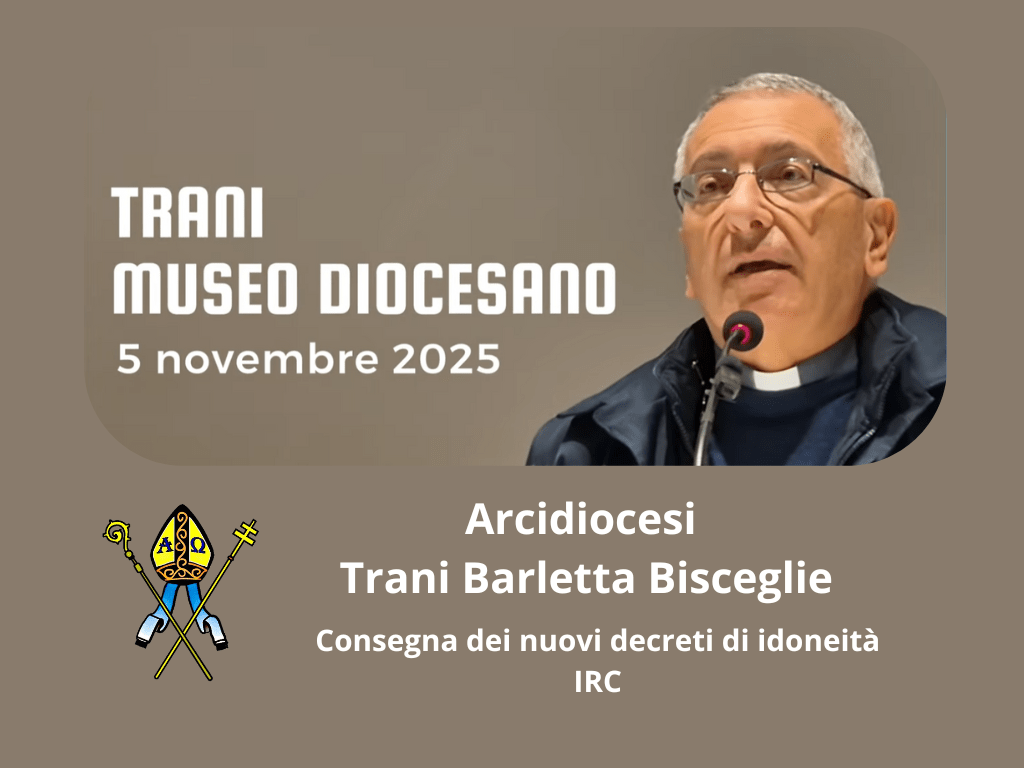 dioc. Trani Intervento dell’Arcivescovo in occasione della consegna dei nuovi decreti di idoneità IRC 12 Novembre 2025 0 8 https://youtu.be/Yonq6QJ9rE0 clic qui per l’articolo sul sito della Diocesi di Trani-Bisceglie-Barletta ARTICOLI CORRELATIALTRO DALL'AUTORE INCONTRO DI CLERO ZONA PASTORALE OFANTINA Trinitapoli, 17 novembre 2025 V Giornata nazionale di preghiera per le vittime e i sopravvissuti agli abusi nella Chiesa “Rispetto. Generare relazioni autentiche”. VERSO LA GIORNATA DIOCESANA DELLA GIOVENTU’ “UN VOTO per COSTRUIRE SPERANZA e FRATERNITA’” – MARGHERITA DI SAVOIA, PARROCCHIA MARIA SS. ADDOLORATA, CELEBRAZIONE EUCARISTICA PRESIEDUTA DALL’ARCIVESCOVO PER L’INIZIO DEL MINISTERO PASTORALE DI PARROCO DI PADRE VINCENZO GROSSANO