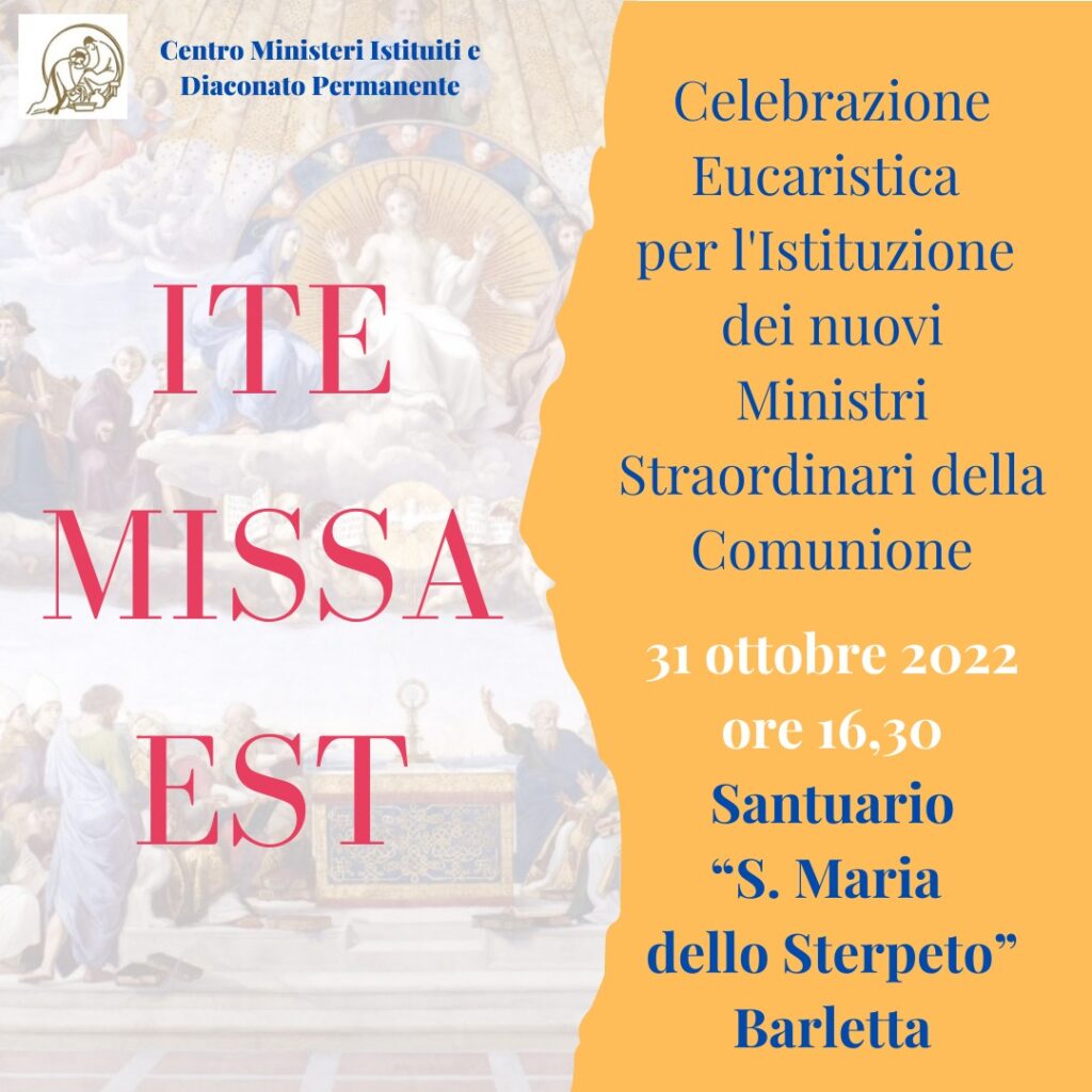 Ite Missa est. Percorso formativo per i nuovi Ministri Straordinari della Comunione. Il ritiro in preparazione al conferimento del Ministero Straordinario della Comunione si terrà il 30 ottobre dalle ore 16,30 alle ore 20,00 presso il Seminario Diocesano. La celebrazione eucaristica, il rito di istituzione dei nuovi MSC e il rinnovo per i MSC a scadenza del loro triennio si terrà lunedì 31 ottobre ore … Continua a leggere ITE MISSA EST. PERCORSO FORMATIVO PER I NUOVI MINISTRI STRAORDINARI DELL’EUCARISTIA