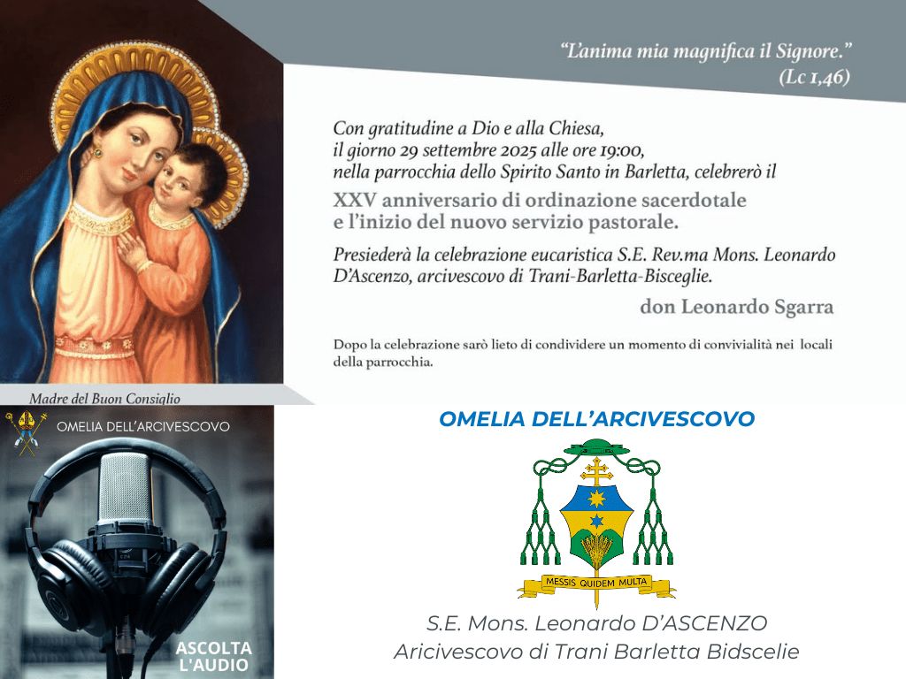 dioc. Trani IX GIORNATA MONDIALE DEI POVERI 8 Novembre 2025 0 7 clic qui per l’articolo sul sito della Diocesi di Trani-Bisceglie-Barletta ARTICOLI CORRELATIALTRO DALL'AUTORE A CORATO UN INCONTRO SULLA LIBERTA’ DI STAMPA – Un diritto da conoscere, difendere e onorare – Per giornalisti e per l’intero pubblico BISCEGLIE, PARROCCHIA SANT’ANDREA APOSTOLO, CELEBRAZIONE EUCARISTICA PRESIEDUTA DALL’ARCIVESCOVO PER L’INIZIO DEL MINISTERO PASTORALE DI PARROCO DI DON FRANCESCO LORUSSO INCONTRO DI CLERO ZONA PASTORALE OFANTINA Trinitapoli, 17 novembre 2025 V Giornata nazionale di preghiera per le vittime e i sopravvissuti agli abusi nella Chiesa “Rispetto. Generare relazioni autentiche”. VERSO LA GIORNATA DIOCESANA DELLA GIOVENTU’