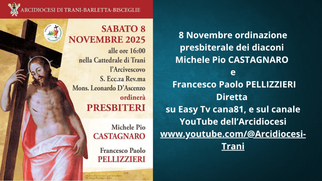 dioc. Trani L’8 NOVEMBRE L’ORDINAZIONE PRESBITERALE DEI DIACONI MICHELE PIO CASTAGNARO E FRANCESCO PAOLO PELLIZZIERI 7 Novembre 2025 0 8 clic qui per l’articolo sul sito della Diocesi di Trani-Bisceglie-Barletta ARTICOLI CORRELATIALTRO DALL'AUTORE A CORATO UN INCONTRO SULLA LIBERTA’ DI STAMPA – Un diritto da conoscere, difendere e onorare – Per giornalisti e per l’intero pubblico BISCEGLIE, PARROCCHIA SANT’ANDREA APOSTOLO, CELEBRAZIONE EUCARISTICA PRESIEDUTA DALL’ARCIVESCOVO PER L’INIZIO DEL MINISTERO PASTORALE DI PARROCO DI DON FRANCESCO LORUSSO INCONTRO DI CLERO ZONA PASTORALE OFANTINA Trinitapoli, 17 novembre 2025 V Giornata nazionale di preghiera per le vittime e i sopravvissuti agli abusi nella Chiesa “Rispetto. Generare relazioni autentiche”. VERSO LA GIORNATA DIOCESANA DELLA GIOVENTU’