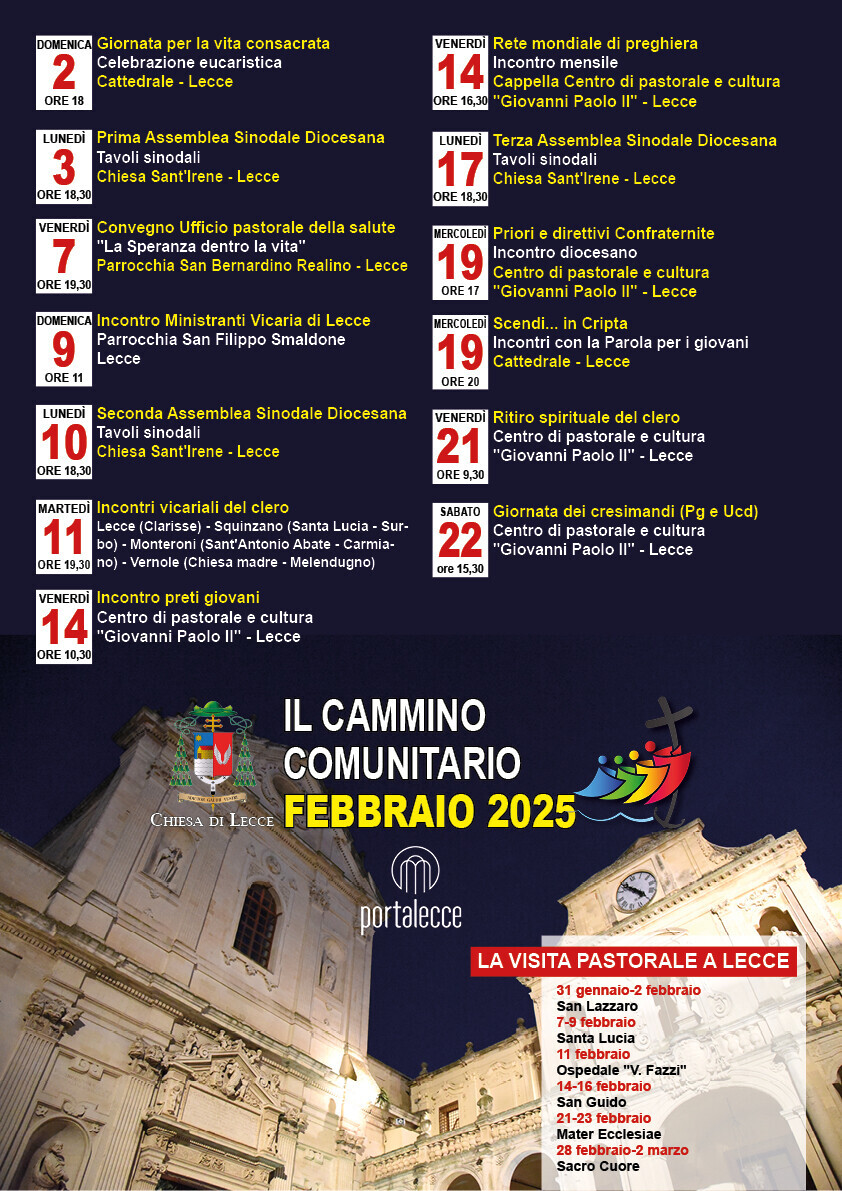Il mese di febbraio si preannuncia ricco di appuntamenti che scandiranno il cammino della Chiesa di Lecce guidata dall’arcivescovo metropolita Michele Seccia e dall’arcivescovo coadiutore Angelo Raffaele Panzetta.
