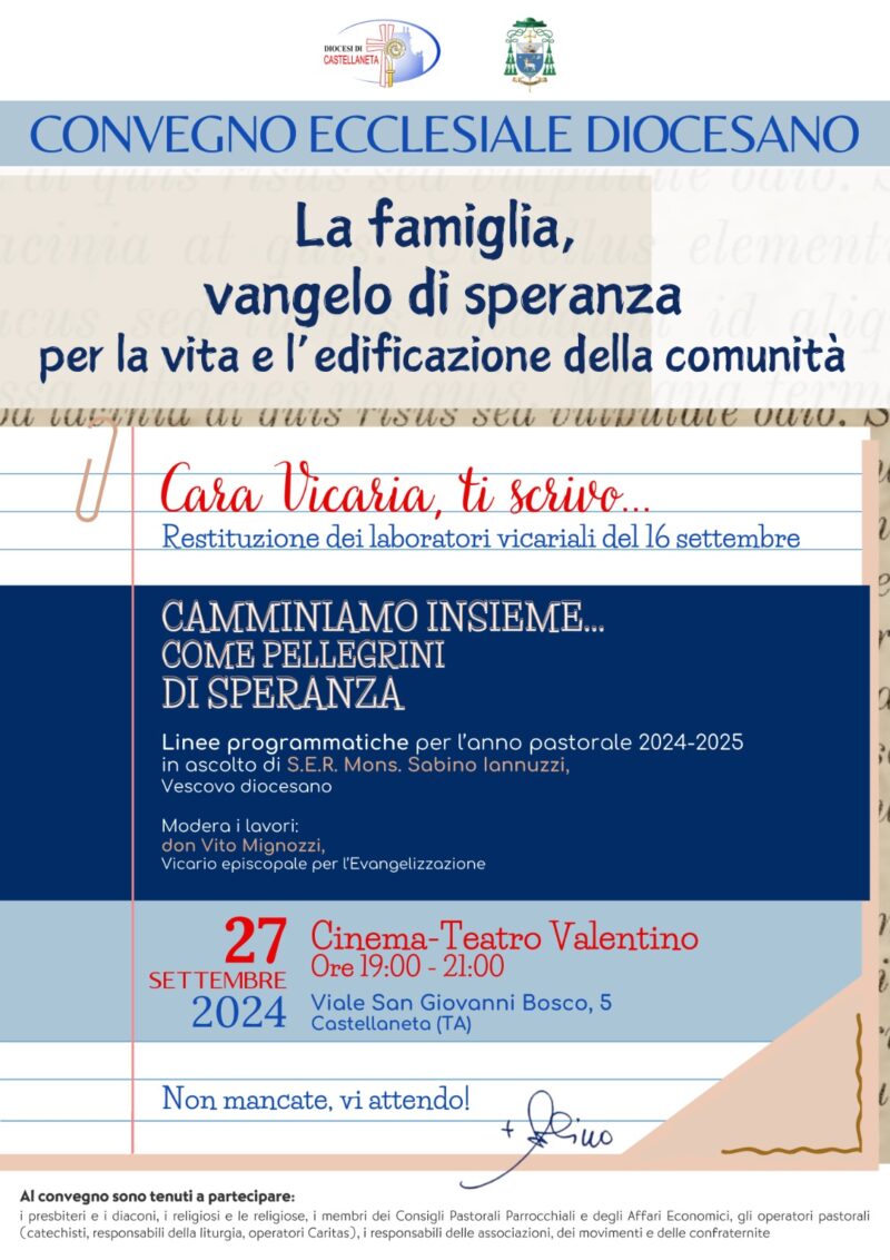 Venerdì 27 Settembre 2024 dalle ore 19:00 alle ore 21:00 presso il Cinema-Teatro Valentino di Castellaneta si svolgerà la giornata conclusiva del Convegno Ecclesiale Diocesano 2024. Come ricordato dal nostro Vescovo nel messaggio di invito al Convegno “continuiamo il nostro confronto sul valore della famiglia riconsiderata alla luce della vita e della missione della comunità cristiana, chiamata a sperimentarsi nell’annuncio di speranza al fine di vivificare e sostenere le non poche famiglie oggi ferite, con l’obiettivo di provocare il rinnovamento e la conversione missionaria delle Parrocchie, chiamate ad essere Chiesa tra le case degli uomini e delle donne di oggi”.