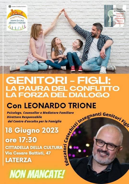 Domenica 18 Giugno 2023 alle ore 17:30 presso la Cittadella della Cultura di Laterza, il Progetto Nazareth, con la collaborazione dell’Ufficio diocesano per la Pastorale Familiare, incontro con Leonardo Trione sul rapporto genitori-figli.