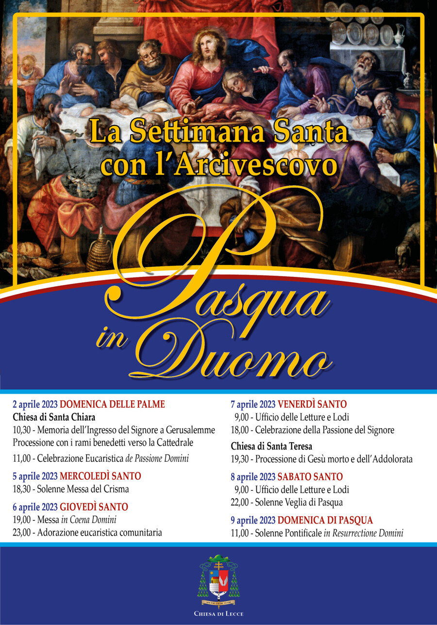 L’Ufficio liturgico diocesano ha già diramato il calendario dei riti. Si comincia la Domenica delle Palme: alle 10,30 sul sagrato della chiesa di Santa Chiara la Commemorazione dell’ingresso del Signore in Gerusalemme con la benedizione dei ramoscelli d’ulivo e la processione verso la chiesa cattedrale dove l’arcivescovo presiederà la solenne celebrazione eucaristica de Passione Domini.