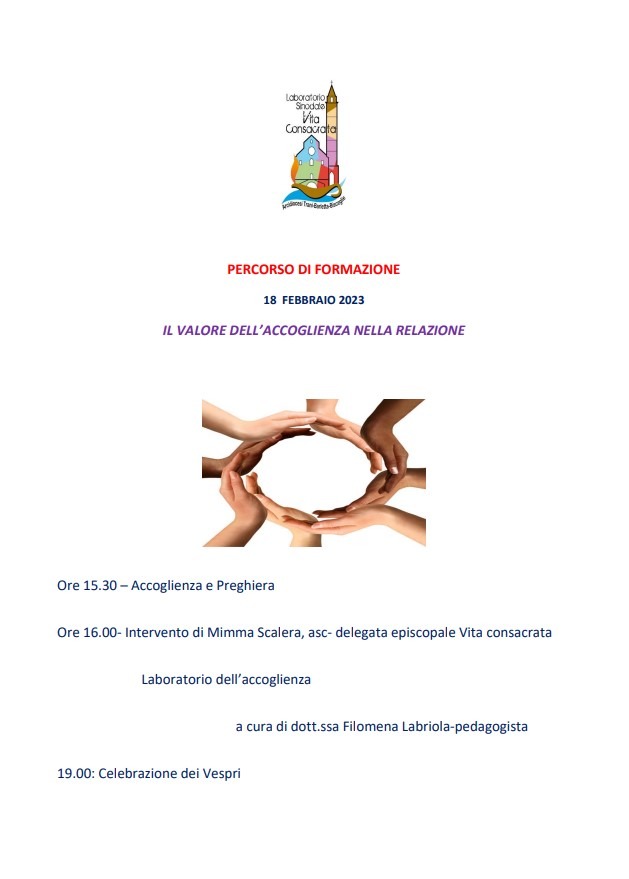 dioc. Trani LABORATORIO SINODALE VITA CONSACRATA – IL VALORE DELL’ACCOLGIENZA NELLA RELAZIONE 17 Febbraio 2023 0 27 clic qui per l’articolo sul sito della Diocesi di Trani-Bisceglie-Barletta ARTICOLI CORRELATIALTRO DALL'AUTORE GIORNATA PRO ORANTIBUS – MONASTERO SAN RUGGIERO INCONTRO DI CLERO ZONA PASTORALE TRANI “SAN NICOLA PELLEGRINO” Giovedì 20 novembre 2025 PDF: I CONTENUTI DEL PRIMO INCONTRO – Prof. Pier Cesare RIVOLTELLA Prof. Pier Cesare RIVOLTELLA – PRIMA SESSIONE INCONTRO DIOCESANO A CORATO UN INCONTRO SULLA LIBERTA’ DI STAMPA – Un diritto da conoscere, difendere e onorare – Per giornalisti e per l’intero pubblico