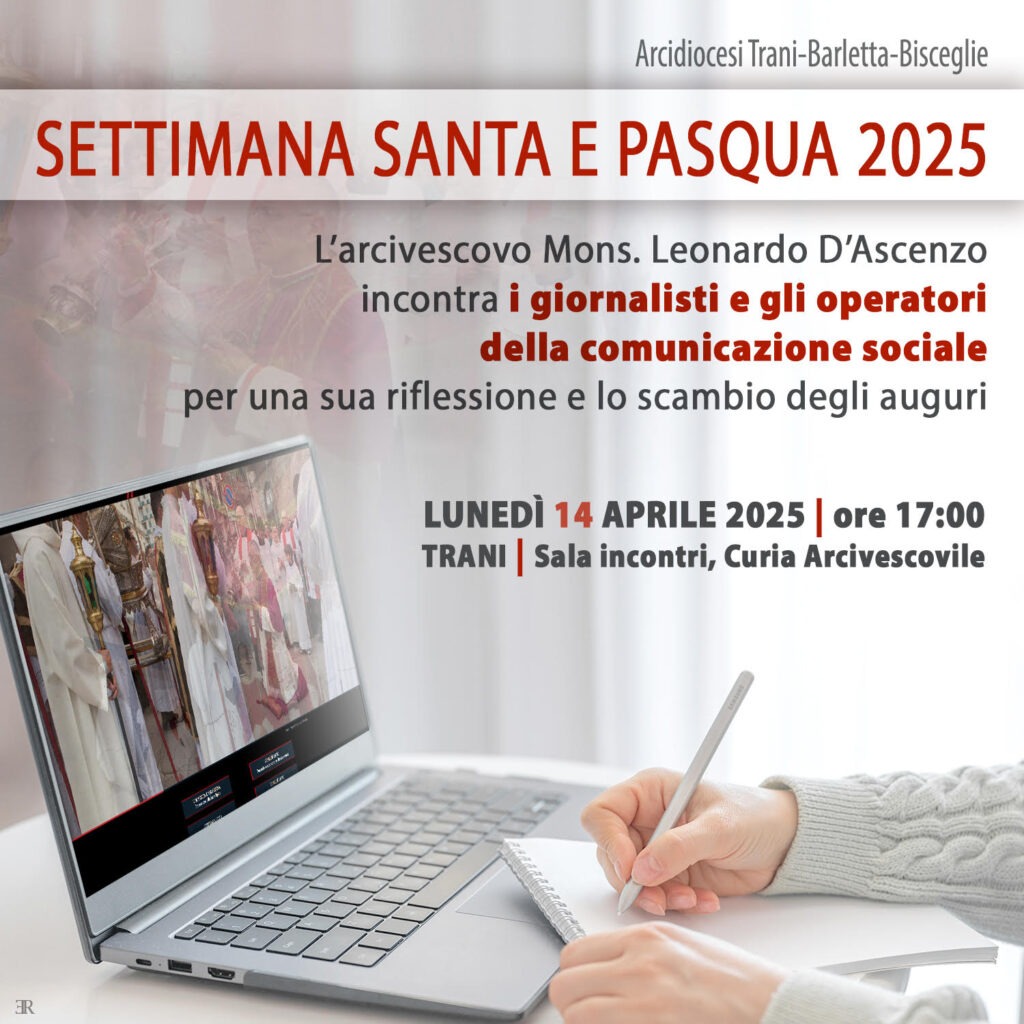 Lunedì 14 aprile 2025, a Trani, nella Curia Arcivescovile, alle ore 17.00, l’Arcivescovo Mons. Leonardo D’Ascenzo incontrerà i giornalisti e gli operatori della comunicazione sociale sul per una riflessione sulla Quaresima e Pasqua, e per lo scambio degli auguri. Si invita alla partecipazione.