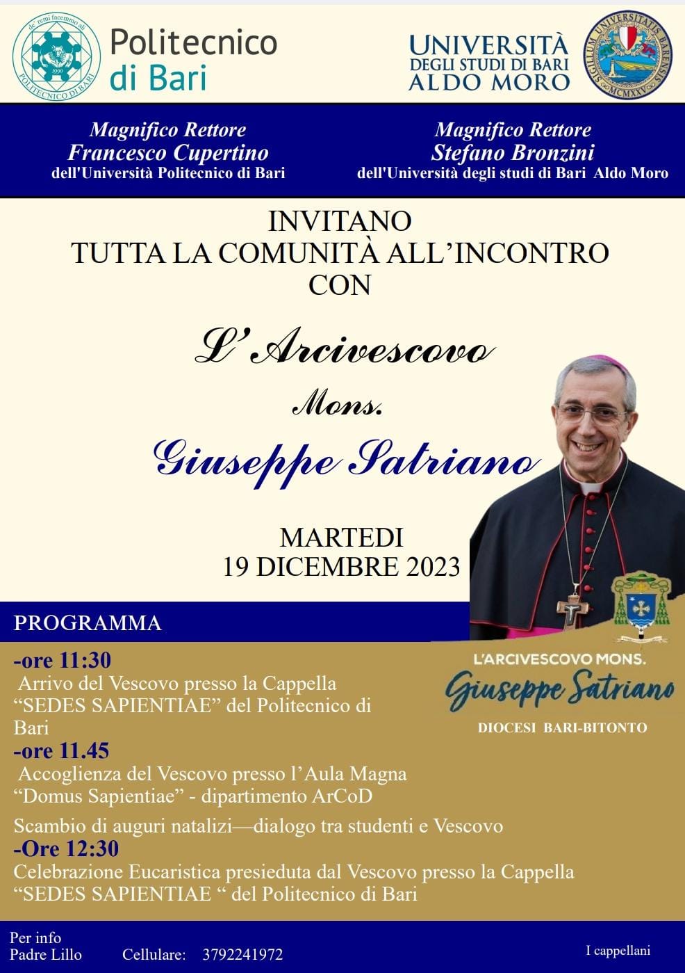 Martedì 19 dicembre, presso il Campus universitario di Bari, l’Arcivescovo farà visita agli studenti, ai docenti e al personale della Comunità Accademica del Politecnico di Bari.