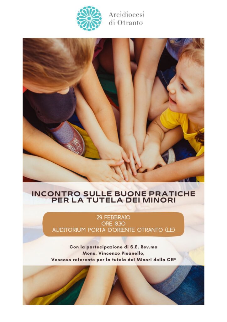 Giovedì 29 febbraio si svolgerà un incontro sulle buone pratiche per la tutela dei minori presso l’Auditorium Porta d’Oriente di Otranto alle ore 18:30. Con la partecipazione di S.E. Rev.ma
