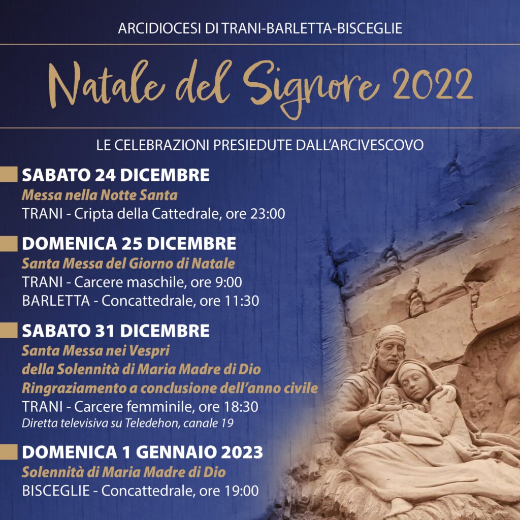 LE CELEBRAZIONI PRESIEDUTE DALL’ARCIVESCOVO Di seguito il programma delle celebrazioni che, nel periodo natalizio, saranno presiedute dall’Arcivescovo: SABATO 24 DICEMBRE Messa nella Notte Santa Trani, Cripta della Cattedrale, ore 23.00 DOMENICA 25 DICEMBRE Santa Messa del Giorno di Natale Trani, Carcere maschile, ore 9.00 Barletta, Concattedrale, ore 11.30 SABATO 31 DICEMBRE Messa nei Vespri della Solennità di Maria Madre di Dio Ringraziamento a … Continua a leggere LE CELEBRAZIONI PRESIEDUTE DALL’ARCIVESCOVO