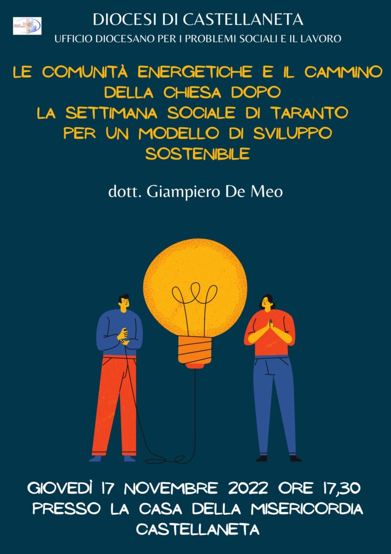 Al via il percorso promosso dall’Ufficio Diocesano per i problemi sociali e il lavoro per l’anno 2022-2023 con il primo appuntamento, dedicato al tema della transizione energetica. Le comunità energetiche rappresentano non solo la via indicata dalla Settimana Sociale dei cattolici italiani per il cammino della Chiesa in Italia, ma anche una sfida inderogabile. Giovedì 17 novembre, presso la Casa della misericordia di Castellaneta, alle ore 17,30 ci sarà un intervento del dott. De Meo Giampiero sul tema, cui seguirà un dibattito pubblico.