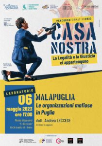 Sabato 6 maggio, alle ore 17:00, presso il Museo diocesano “San Riccardo” di Andria, si terrà il 3° incontro/laboratorio della Scuola Politica 2023 promossa dal Forum Di Formazione all’Impegno Sociale e Politico della Diocesi di Andria dal titolo MALAPUGLIA: Le organizzazioni mafiose in Puglia.
