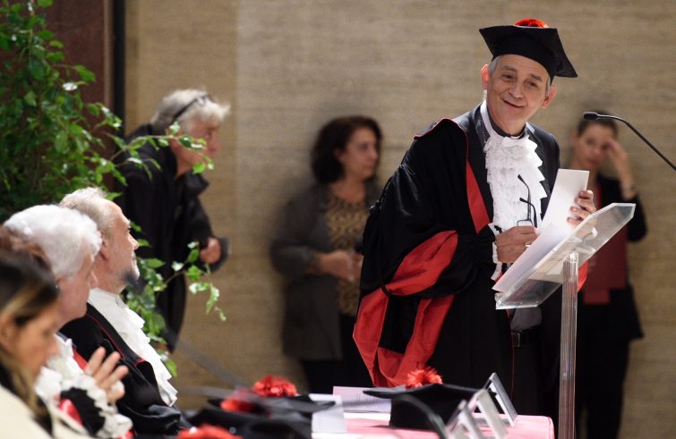 Lasciatemi terminare queste mie parole con un sogno sul mondo, un sogno di giustizia e di uguaglianza che è quello del papa. Quando visitò Bologna, cinque anni or sono parlò di Diritto alla pace, celebrando l’anniversario dei trattati di Roma che dettero vita “dopo due guerre mondiali e violenze atroci di popoli contro popoli” all’Unione proprio per tutelare il diritto alla pace. “Ma oggi molti interessi e non pochi conflitti sembrano far svanire le grandi visioni di pace. Sperimentiamo una fragilità incerta e la fatica di sognare in grande. Ma non abbiate paura dell’unità! Le logiche particolari e nazionali non vanifichino i sogni coraggiosi dei fondatori dell’Europa unita. E mi riferisco non solo a quei grandi uomini di cultura e di fede che diedero la vita per il progetto europeo, ma anche ai milioni di persone che persero la vita perché non c’erano unità e pace. Cent’anni fa si levò il grido di Benedetto XV, che era stato Vescovo di Bologna, il quale definì la guerra «inutile strage» (Lettera ai Capi dei Popoli belligeranti, 1° agosto 1917). Aiutiamoci, come afferma la Costituzione Italiana, a “ripudiare la guerra” (cfr Art. 11), a intraprendere vie di nonviolenza e percorsi di giustizia, che favoriscono la pace. Perché di fronte alla pace non possiamo essere indifferenti o neutrali. Il Cardinale Lercaro qui disse: «La Chiesa non può essere neutrale di fronte al male, da qualunque parte esso venga: la sua vita non è la neutralità, ma la profezia» (Omelia, 1° gennaio 1968). Non neutrali, ma schierati per la pace! Perciò invochiamo lo ius pacis, come diritto di tutti a comporre i conflitti senza violenza. Per questo ripetiamo: mai più la guerra, mai più contro gli altri, mai più senza gli altri! Vengano alla luce gli interessi e le trame, spesso oscuri, di chi fabbrica violenza, alimentando la corsa alle armi e calpestando la pace con gli affari”. “L’Università è sorta qui per lo studio del diritto, per la ricerca di ciò che difende le persone, regola la vita comune e tutela dalle logiche del più forte, della violenza e dell’arbitrio. È una sfida attuale: affermare i diritti delle persone e dei popoli, dei più deboli, di chi è scartato, e del creato, nostra casa comune. Non credete a chi vi dice che lottare per questo è inutile e che niente cambierà! Non accontentatevi di piccoli sogni, ma sognate in grande. Sogno anch’io, ma non solo mentre dormo, perché i sogni veri si fanno ad occhi aperti e si portano avanti alla luce del sole. Rinnovo con voi il sogno di «un nuovo umanesimo europeo, cui servono memoria, coraggio, sana e umana utopia»; di un’Europa madre, che «rispetta la vita e offre speranze di vita»; di un’Europa «dove i giovani respirano l’aria pulita dell’onestà, amano la bellezza della cultura e di una vita semplice, non inquinata dagli infiniti bisogni del consumismo; dove sposarsi e avere figli sono una responsabilità e una gioia grande, non un problema dato dalla mancanza di un lavoro sufficientemente stabile» (Discorso per il conferimento del Premio Carlo Magno, 6 maggio 2016). Sogno un’Europa “universitaria e madre” che, memore della sua cultura, infonda speranza ai figli e sia strumento di pace per il mondo”.