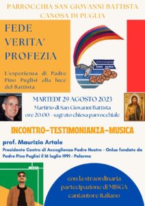 Ci domandiamo: è ancora attuale il Vangelo? Ecco la risposta attraverso il martirio del Beato Pino Puglisi. Il prof. Maurizio Artale –conclude il parroco Pinnelli– Presidente del Centro Padre Nostro (centro fondato direttamente dal Beato Puglisi nel quartiere Brancaccio), ci parlerà del Beato Pino Puglisi alla luce dell’esperienza del Battista».