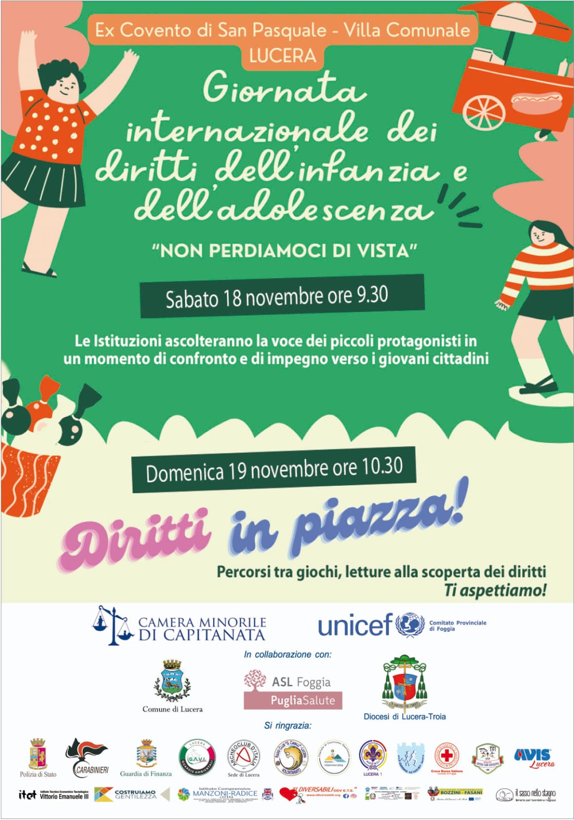 SABATO 18 NOVEMBRE. Dalle ore 9.30, sabato 18 novembre, nell’ex Convento di San Pasquale – Villa comunale di Lucera, i bambini saranno protagonisti facendo ascoltare la loro voce e le loro istanze in un momento di confronto con istituzioni e associazioni. Titolo dell’iniziativa è “Non perdiamoci di vista”, con i più piccoli che chiederanno agli adulti di prendere impegni concreti rispetto a quanto metteranno in evidenza per realizzare una città a misura di bambino.
