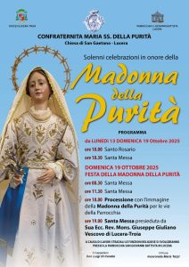 Nella serata di domenica 19 ottobre 2025, XXIX domenica del tempo ordinario, Mons. Vescovo ha presieduto la Santa Messa nella Parrocchia di S. Giovanni Battista, a Lucera, in onore di S. Maria della Purità, venerata nella vicina cappella, in rione Porta Foggia.