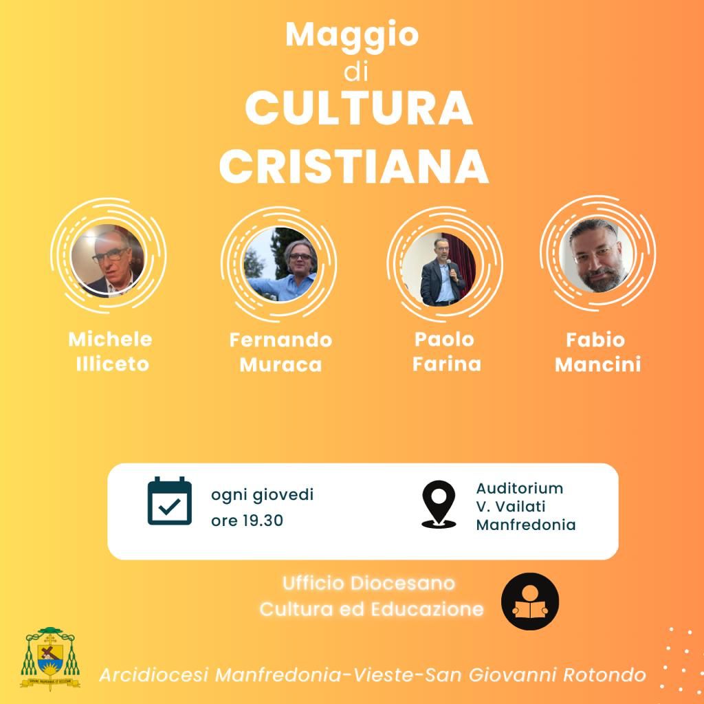 Torna anche quest’anno il “Maggio di cultura cristiana” proposto dall’Ufficio Cultura ed Educazione della Arcidiocesi di Manfredonia-Vieste-San Giovanni Rotondo. Ogni giovedì alle 19.30 un incontro su temi ed idee per interpretare il mondo contemporaneo.