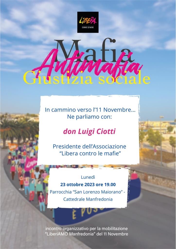 dioc. Manfredonia Manfredonia incontra don Luigi Ciotti – Arcidiocesi di Manfredonia – Vieste – San Giovanni Rotondo 22 Ottobre 2023 0 29 22 Ottobre 202322 Ottobre 2023 In vista della Mobilitazione dell’11 novembre contro le mafie, nella Cattedrale di Manfredonia, don Luigi Ciotti presidente dell’Associazione Libera, incontra la cittadinanza. Siamo tutti invitati a partecipare! clic qui per l’articolo sul sito diocesano ARTICOLI CORRELATIALTRO DALL'AUTORE RETE INTERNAZIONALE “PRETI CONTRO IL GENOCIDIO” – Lettera aperta ai Vescovi Italiani in occasione della preghiera per la pace ORDINAZIONE DI DON MICHELE COPPOLECCHIA – Arcidiocesi di Manfredonia – Vieste – San Giovanni Rotondo ORDINAZIONE PRESBITERALE DI DON ELISEO COSTANTINO – Arcidiocesi di Manfredonia – Vieste – San Giovanni Rotondo GIORNATA MONDIALE DEI POVERI – 2025 – Arcidiocesi di Manfredonia – Vieste – San Giovanni Rotondo Un voto per costruire Speranza e Fraternità – Arcidiocesi di Manfredonia – Vieste – San Giovanni Rotondo