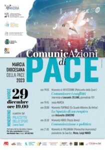 In preparazione alla 57ª Giornata mondiale della Pace del 1° gennaio 2024 e per sottolineare il valore universale della Pace, l’Ufficio di Pastorale Sociale-Lavoro-Giustizia-Pace e Salvaguardia del Creato, con la collaborazione degli Uffici Pastorali della Diocesi di Andria: Comunicazioni Sociali, Servizio di Pastorale Giovanile e Caritas, delle Associazioni Ecclesiali: Azione Cattolica, Movimento Ecclesiale di Impegno Culturale e Forum di Formazione all’Impegno Sociale e Politico, delle Associazioni: Libera (Associazioni, nomi e numeri contro le mafie) “R. Fonte” di Andria, Scuola di formazione Socio-Politica -Cercasi un Fine di Minervino, SCOUT-Agesci di Canosa di Puglia e Minervino Murge, Libera Associazione di Volontariato di Minervino Murge e con il patrocinio del Comune di Minervino Murge, organizza la: