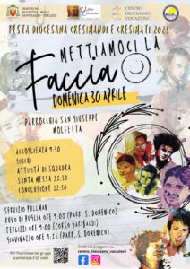 Gli uffici diocesani per la pastorale vocazionale e per la catechesi, insieme alle comunità religiose della nostra Diocesi promuovono un momento di festa con i cresimandi e cresimati dell’anno catechistico in corso “Mettiamoci la faccia”. Un occasione per rinnovare il grazie ai catechisti ed educatori che hanno accompagnato i ragazzi in questi anni di iniziazione cristiana e sperimentare l’amicizia di tanti altri ragazzi che come ognuno di loro si trova a vivere questo momento di passaggio, e magari cercando riaccendere il desiderio di continuare a vivere il cammino nella comunità cristiana.