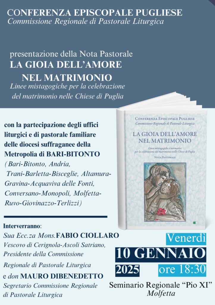 dioc. Trani MOLFETTA, LA PRESENTAZIONE DELLA NOTA DELLA CEP “LA GIOIA DELL’AMORE NEL MATRIMONIO” 3 Gennaio 2025 0 25 clic qui per l’articolo sul sito della Diocesi di Trani-Bisceglie-Barletta ARTICOLI CORRELATIALTRO DALL'AUTORE GIORNATA PRO ORANTIBUS – MONASTERO SAN RUGGIERO INCONTRO DI CLERO ZONA PASTORALE TRANI “SAN NICOLA PELLEGRINO” Giovedì 20 novembre 2025 PDF: I CONTENUTI DEL PRIMO INCONTRO – Prof. Pier Cesare RIVOLTELLA Prof. Pier Cesare RIVOLTELLA – PRIMA SESSIONE INCONTRO DIOCESANO A CORATO UN INCONTRO SULLA LIBERTA’ DI STAMPA – Un diritto da conoscere, difendere e onorare – Per giornalisti e per l’intero pubblico