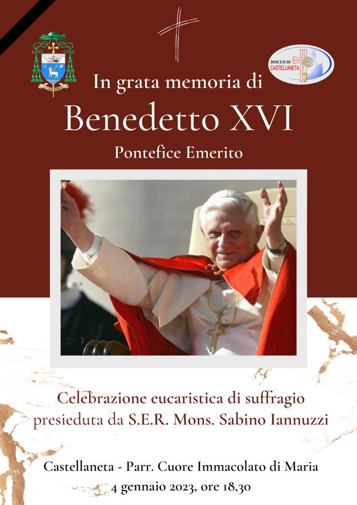 Il Vescovo di Castellaneta, S.E.R. Mons. Sabino Iannuzzi, presiederà la Santa Messa in suffragio di Sua Santità Benedetto XVI, Pontefice Emerito mercoledì 4 gennaio p.v., alle ore 18.30, presso la Parrocchia Cuore Immacolato di Maria in Castellaneta.