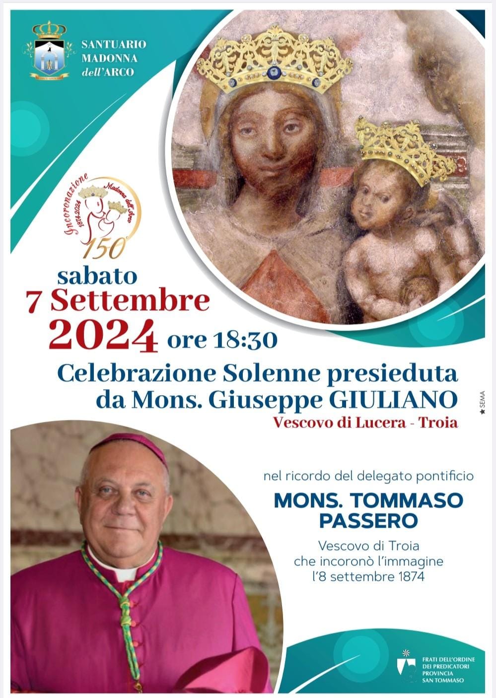In occasione del 150° anniversario dell’Incoronazione della Madonna dell’Arco (8 settembre 1874-2024), il 7 settembre 2024, S.E.R. Mons. Giuseppe Giuliano, vescovo di Lucera-Troia, presiederà la solenne Concelebrazione Eucaristica delle ore 18.30 presso il Santuario della Madonna dell’Arco in Sant’Anastasia (Na). La celebrazione avverrà nel ricordo dell’allora Vescovo di Troia, S.E.R. Mons. Tommaso Passero, dell’ordine dei Predicatori, che, in qualità di delegato pontificio, l’8 settembre 1874, incoronò la sacra immagine.