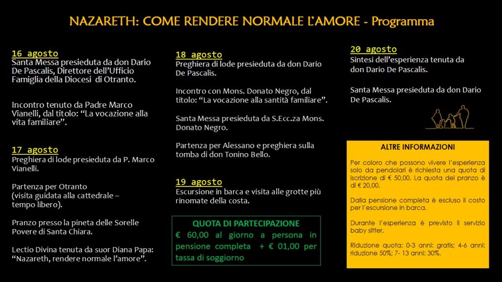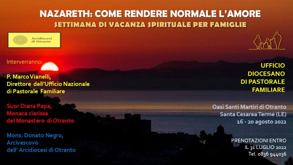 dioc. Otranto Nazareth: come rendere normale l’amore 11 Luglio 2022 0 37 Settimana di vacanza spirituale per le famiglie a cura dell’Ufficio Diocesano di Pastorale Familiare clic qui per l’articolo sul sito diocesano ARTICOLI CORRELATIALTRO DALL'AUTORE COMMENTO AL VANGELO. XXXIII DEL TEMPO ORDINARIO Ammissione di Ludovico Cannazza tra i candidati agli ordini sacri Scuola della Parola – Arcidiocesi di Otranto Lettera dell’Arcivescovo per la chiusura del Giubileo della Speranza DEDICAZIONE DELLA BASILICA LATERANENSE – Arcidiocesi di Otranto