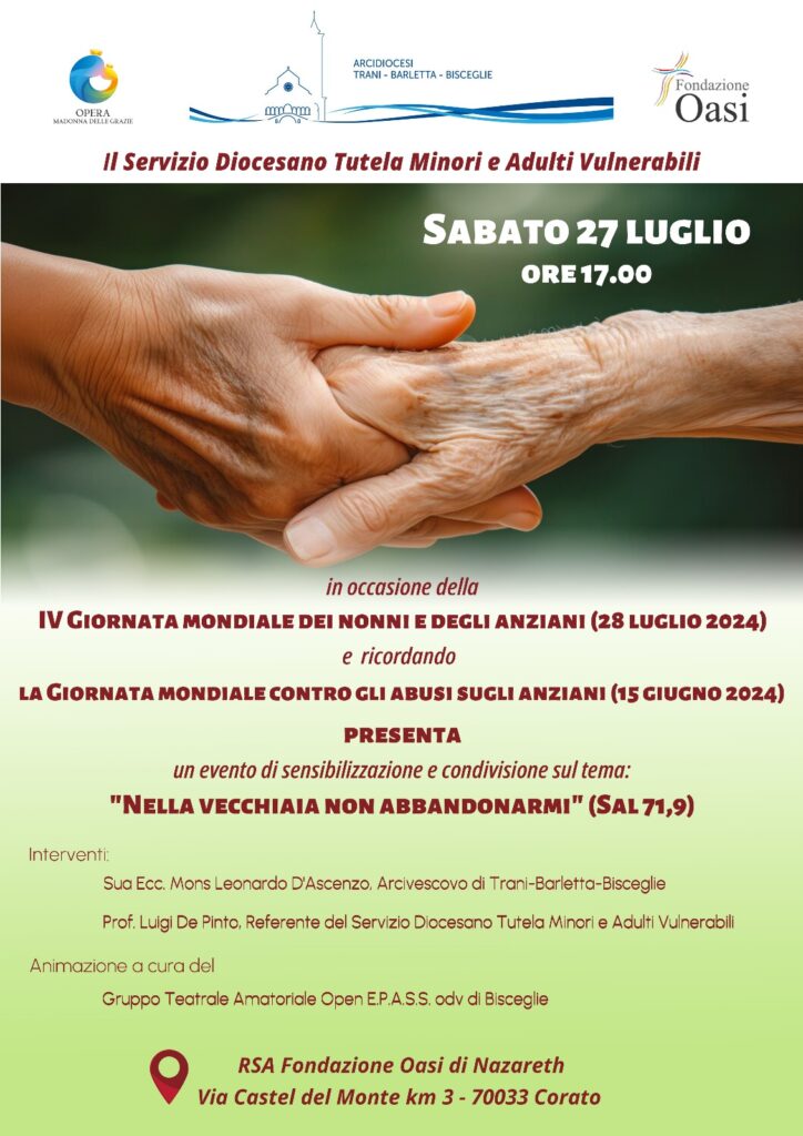 In occasione della IV Giornata Mondiale dei Nonni e degli Anzini (28 luglio 2024) e ricordando la Giornata Mondiale contro gli abusi sugli Anziani (15 giugno 2024), il Servizio diocesano Tutela Minori e Persone Vulnerabili presenta un evento di sensibilizzazione e condivisione sul tema: «“Nella vecchiaia non abbandonarmi “ (Sal 71.9)», che si terrà il 27 luglio 2024, a Corato, presso la RSA Fondazione Oasi … Continua a leggere