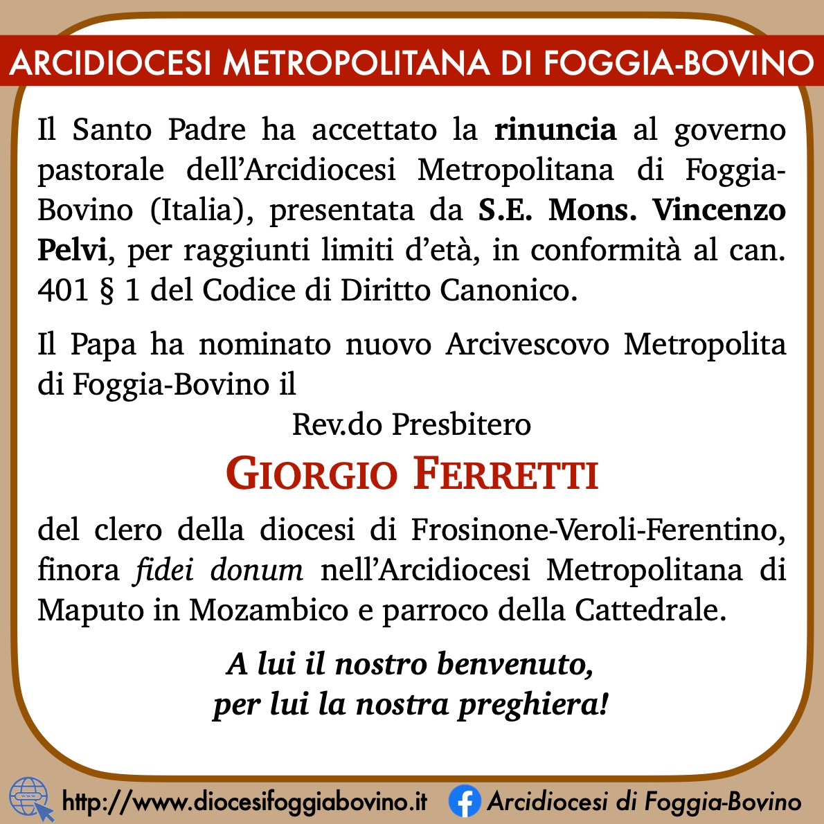 Il vescovo Giuseppe e tutta la comunità diocesana di San Severo augurano all’Arcivescovo eletto di Foggia – Bovino ogni bene nel Signore. E, mentre lo attendono quale Metropolita, pregano per la fecondità del suo ministero in terra di Capitanata.