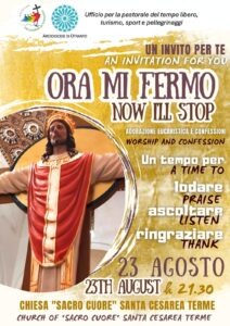 Sabato 23 agosto, dalle 21.30 alle 22.30, presso la chiesa “Sacro Cuore” in Santa Cesarea Terme, ci sarà la possibilità di vivere un momento di adorazione eucaristica e confessioni organizzato dall’Ufficio diocesano per la pastorale del tempo libero, turismo, sport e pellegrinaggi e animato dalle Suore Alcantarine.