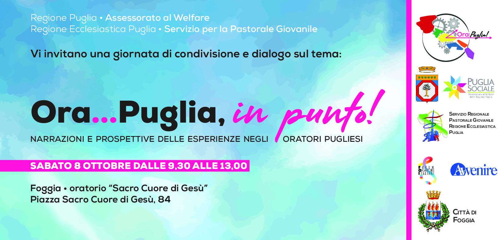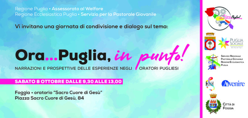 Sabato 8 ottobre è una data importante per la Servizio regionale di Pastorale giovanile di Puglia: a Foggia si terrà una giornata di condivisione e dialogo attorno alle iniziative che sono state realizzate nei diversi oratori delle diocesi di Puglia.