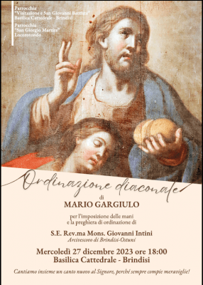 dioc. Brindisi Ordinazione Diaconale 21 Dicembre 2023 0 36 invito clic qui per l’articolo sul sito diocesano ARTICOLI CORRELATIALTRO DALL'AUTORE ITINERARIO CATECHISTICO DIOCESANO 2025-2026 – Arcidiocesi di Brindisi – Ostuni TRASLAZIONE E SEPOLTURA DI MONS. SETTIMIO TODISCO – Arcidiocesi di Brindisi – Ostuni CONFERMATI NELLA FEDE DA PAPA LEONE – Arcidiocesi di Brindisi – Ostuni Don Angelo Ciccarese è tornato alla casa del Padre – Arcidiocesi di Brindisi – Ostuni Apertura del processo diocesano per la beatificazione e canonizzazione del Servo di Dio Teodoro d’Amici – Arcidiocesi di Brindisi – Ostuni