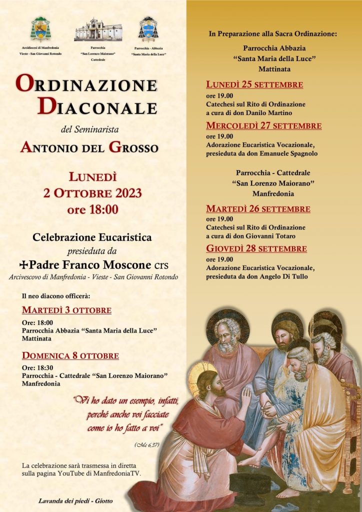dioc. Manfredonia Ordinazione diaconale del seminarista Antonio del Grosso – Arcidiocesi di Manfredonia – Vieste – San Giovanni Rotondo 22 Settembre 2023 0 29 Ordinazione diaconale del seminarista Antonio del Grosso – Arcidiocesi di Manfredonia – Vieste – San Giovanni Rotondo Skip to content clic qui per l’articolo sul sito diocesano ARTICOLI CORRELATIALTRO DALL'AUTORE RETE INTERNAZIONALE “PRETI CONTRO IL GENOCIDIO” – Lettera aperta ai Vescovi Italiani in occasione della preghiera per la pace il giornalismo che fa vivere i settimanali diocesani – Arcidiocesi di Manfredonia – Vieste – San Giovanni Rotondo ORDINAZIONE DI DON MICHELE COPPOLECCHIA – Arcidiocesi di Manfredonia – Vieste – San Giovanni Rotondo ORDINAZIONE PRESBITERALE DI DON ELISEO COSTANTINO – Arcidiocesi di Manfredonia – Vieste – San Giovanni Rotondo GIORNATA MONDIALE DEI POVERI – 2025 – Arcidiocesi di Manfredonia – Vieste – San Giovanni Rotondo
