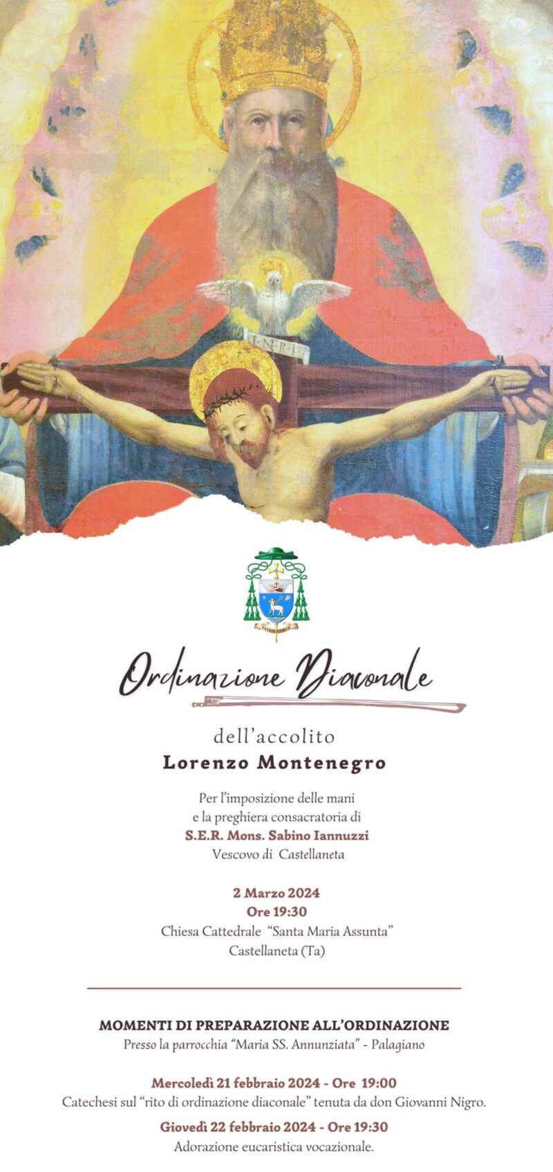 Sabato 2 Marzo 2024, alle ore 19.30 presso la Chiesa Cattedrale “S. Maria Assunta” di Castellaneta, per l’imposizione delle mani e la preghiera consacratoria di S.E.R. Mons. Sabino Iannuzzi, Vescovo di Castellaneta, sarà ordinato Diacono l’Accolito
