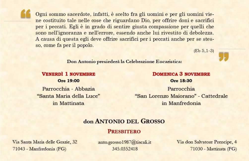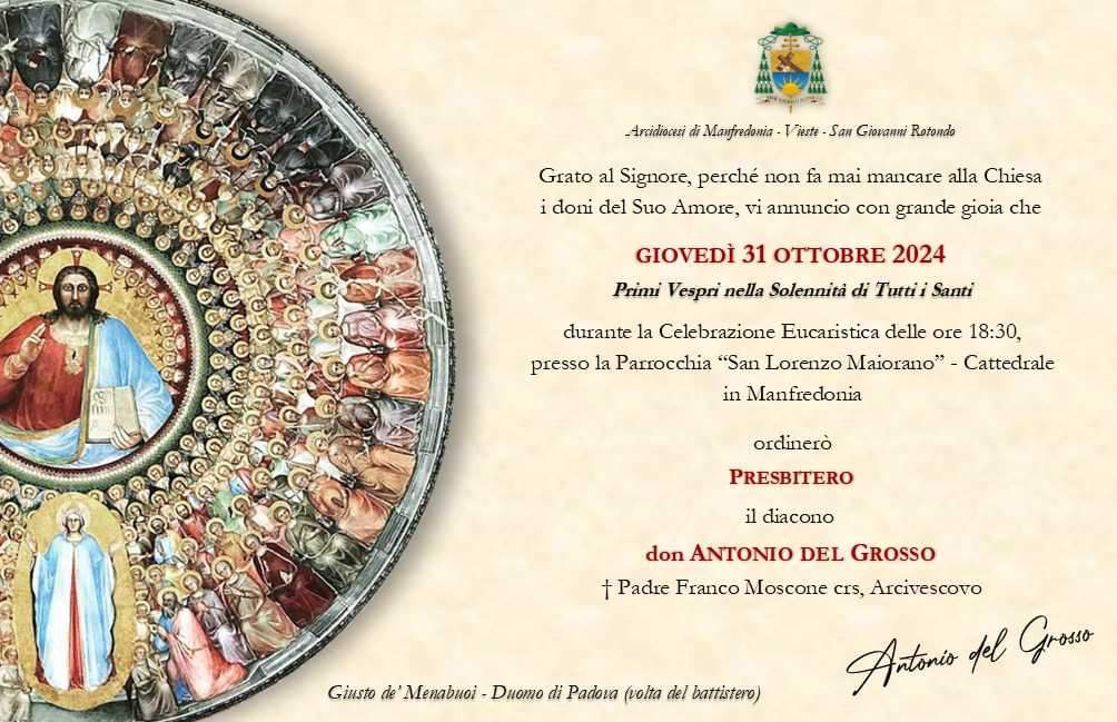 È con gioia e gratitudine al Signore che la Diocesi di Manfredonia-Vieste-San Giovanni Rotondo annuncia l’Ordinazione Presbiterale di Antonio del Grosso. Come comunità ecclesiale stringiamoci in preghiera, per condividere questo momento di grazia, il giorno 31 ottobre 2024 nella Celebrazione Eucaristica presieduta dall’Arcivescovo padre Franco Moscone.