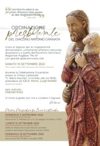 Sabato 10 settembre 2022 alle ore 19:30, nella chiesa Cattedrale di Andria, il Vescovo Mons. Luigi Mansi, imporrà le mani per una nuova consacrazione presbiterale. A dire il suo “eccomi” sarà don Antonio Granata, giovane diacono, che attualmente presta il suo servizio pastorale di Educatore presso il Seminario Vescovile e di collaboratore presso la comunità parrocchiale di “S. Michele Arcangelo e S. Giuseppe”.