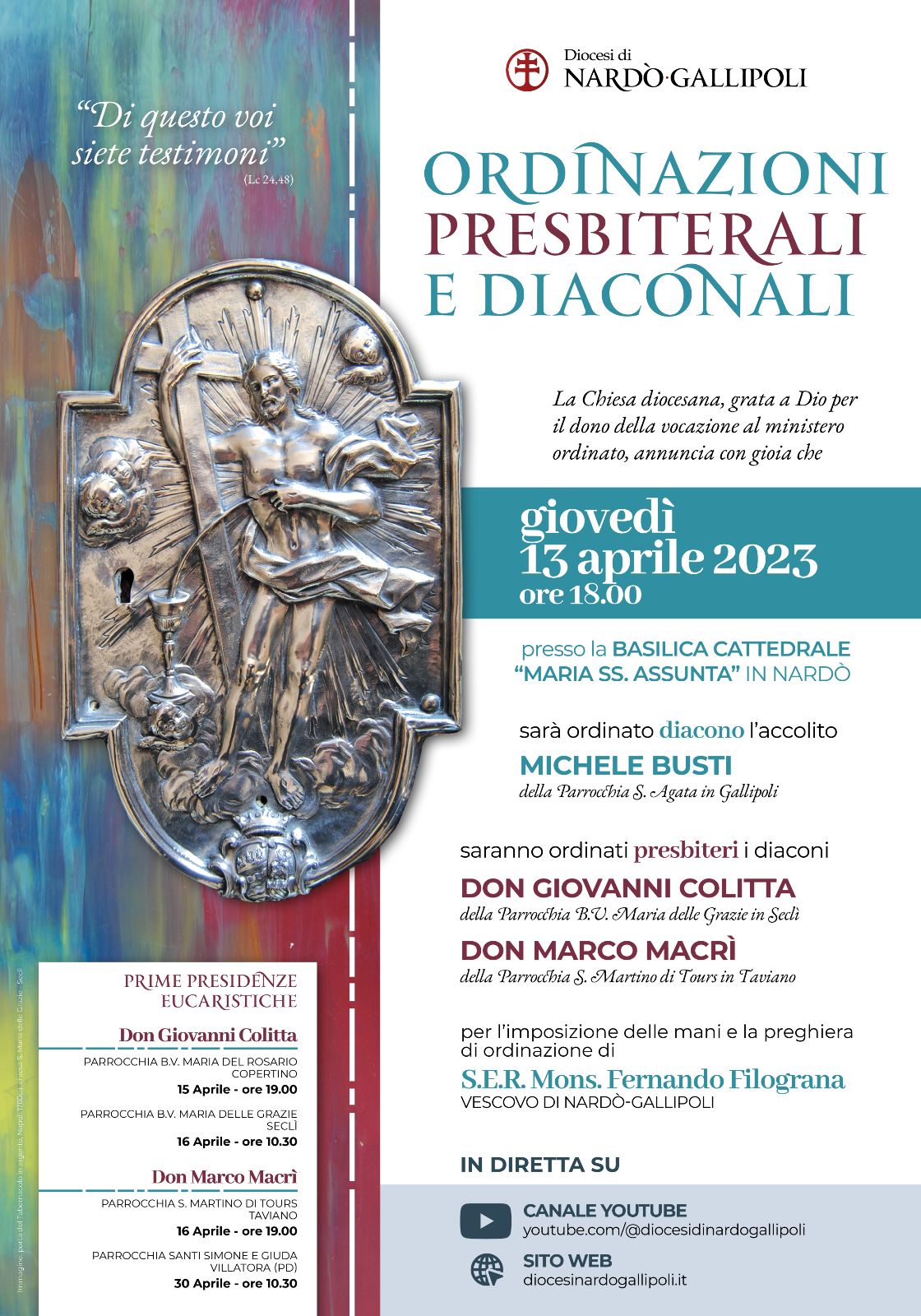Si vestono a festa Seclì, Taviano e Gallipoli, si veste a festa tutta la Diocesi di Nardò-Gallipoli per l’ ordinazione diaconale di Michele Busti e presbiterale di don Giovanni Colitta e don Marco Macrì. La solenne concelebrazione, sarà presieduta da Mons. Fernando Filograna, vescovo di Nardò-Gallipoli, a Nardò, presso la CATTEDRALE MARIA SS. ASSUNTA in Nardò (LE). GIOVEDI’ 13 APRILE 2023 alle ore 18.00